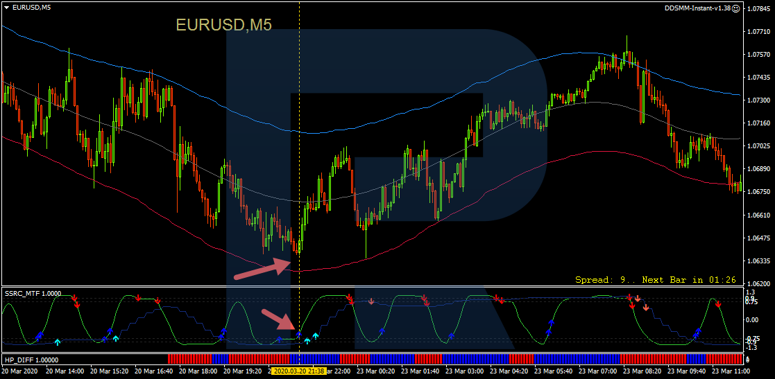 - На индикаторе SSRC сформировался сигнал в форме стрелки, направленной вверх. Если же мы наблюдаем формирование аналогичной стрелки на втором графике М5, в этом случае можно оценивать это как дополнительный сигнал.