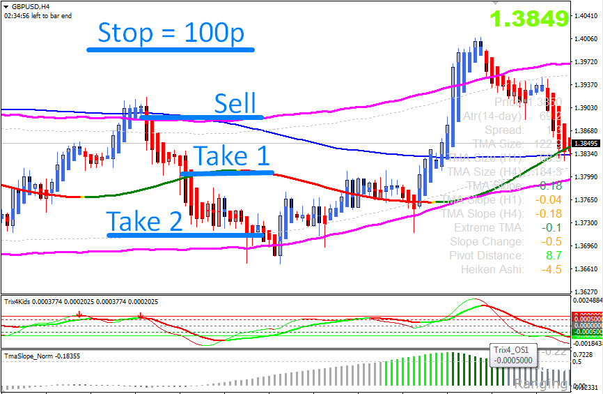 Пример сделки на продажу по стратегии Extreme TMA System. Рынок находится во флэте, поэтому ориентиром для взятия прибыли будет противоположная граница канала