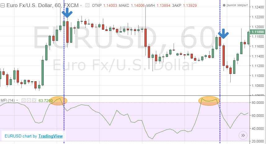 С одной стороны Все очень просто, с другой стороны здесь есть ряд очень важных моментов, которую я хочу рассмотреть. Первый момент заключается в том, что очень тяжело подобрать правильную точку входа, когда цена действительно готова развернуться. Здесь есть два подхода, каждый из которых имеет своих приверженцев. Часть трейдеров говорит о том, что сделку следует открывать в тот момент времени, когда индекс денежного потока только пересекает целевую линию. Например, MFI пересек линию 80 снизу вверх — сразу открывать сделку на понижение. Пример такого подхода представлен ниже.