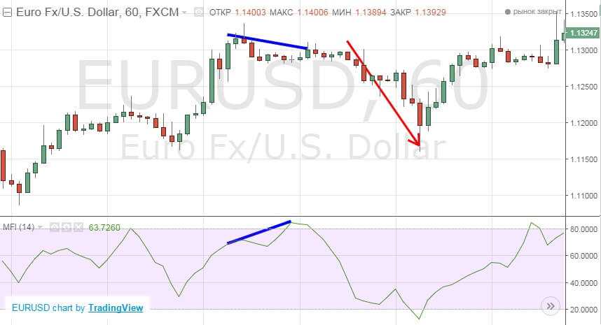 Выше я уже говорил о частых ситуациях, когда мы наблюдаем расхождение в движении цены актива и индикатора. Например, актив растет – индикатор падает. Или Money Flow растет – актив падает. Это все классические случаи расхождения или дивергенции. Такие ситуации практически у каждого инструмента будут говорить о необоснованности движения, в результате чего будет происходить разворот в движении цены. Но в случае с MFI это очень мощный сигнал (многие трейдеры и вовсе говорят, что это единственный сигнал).