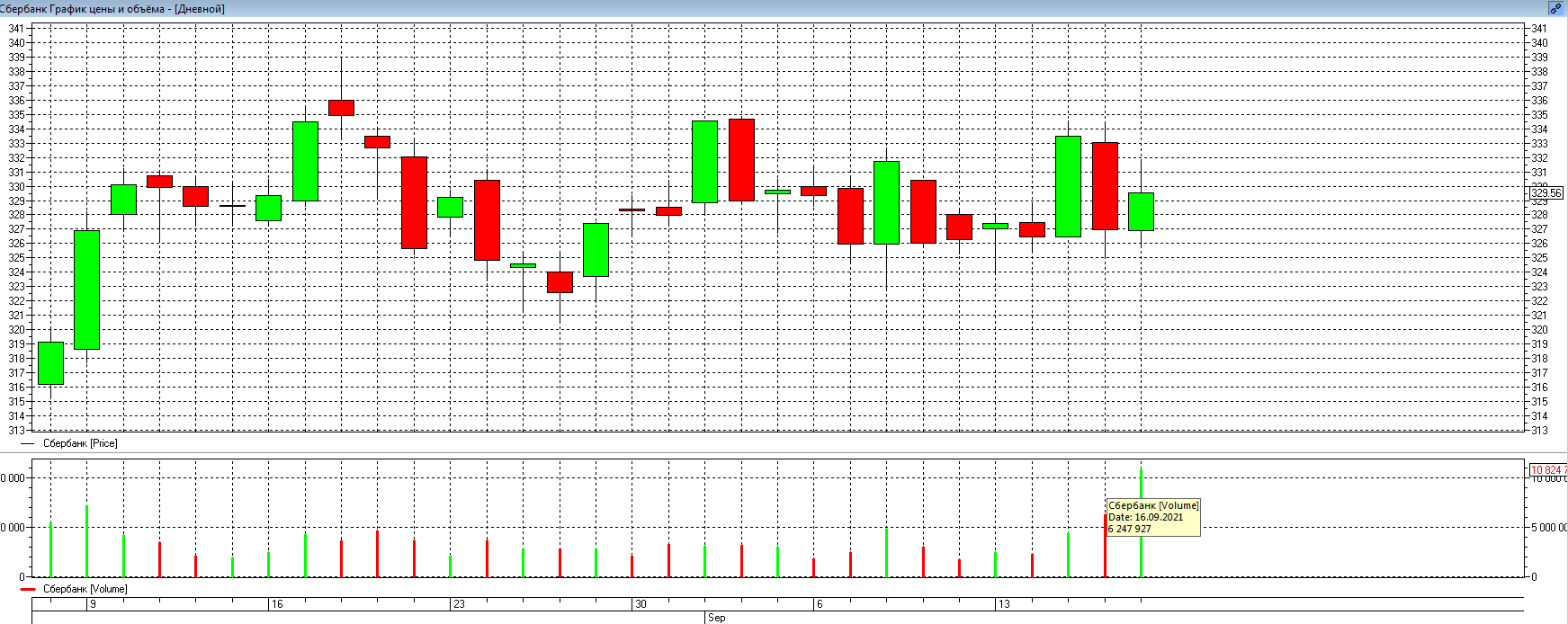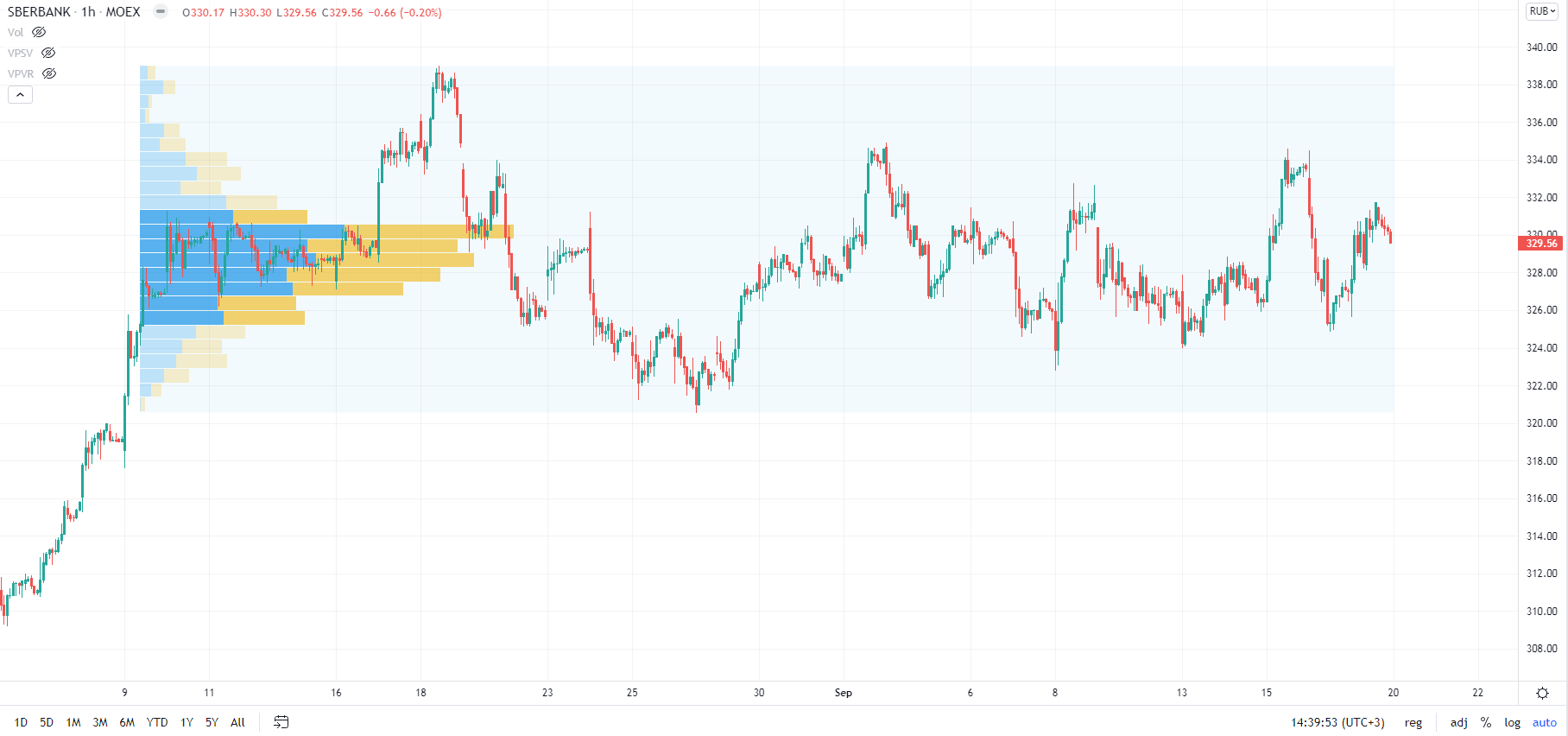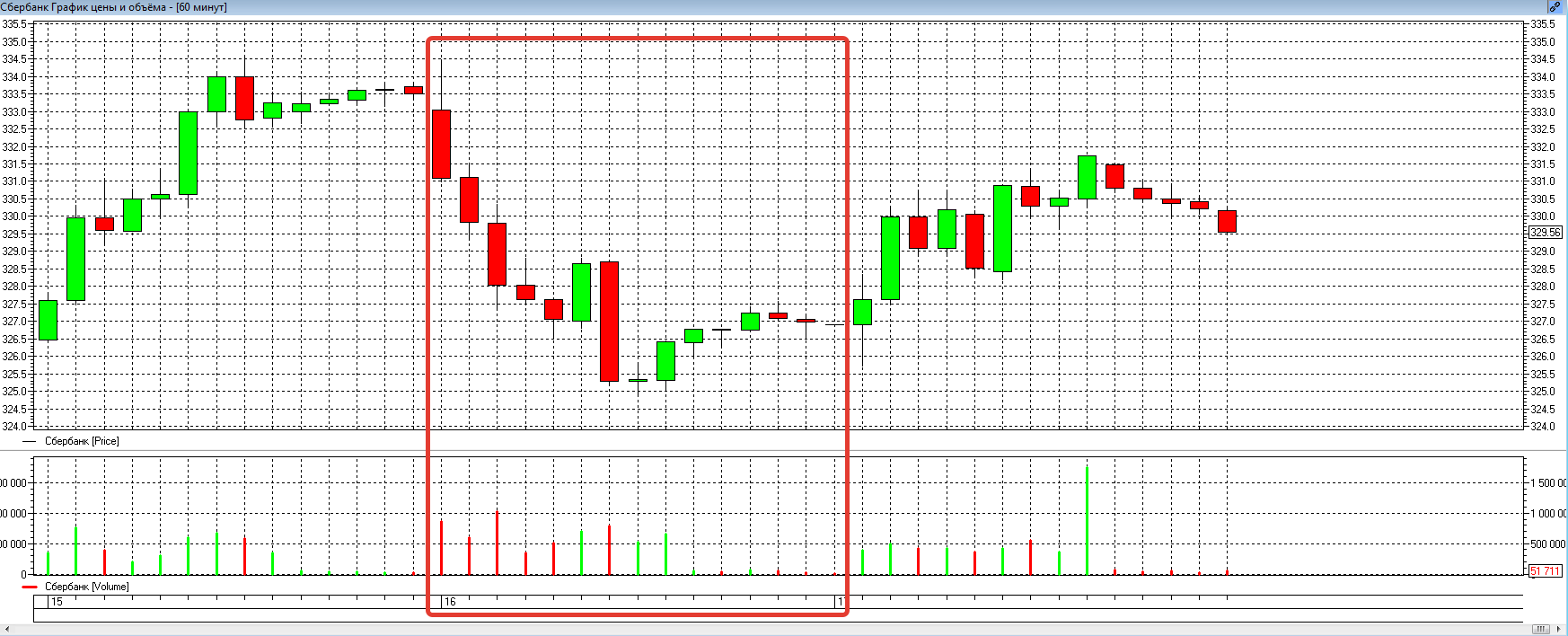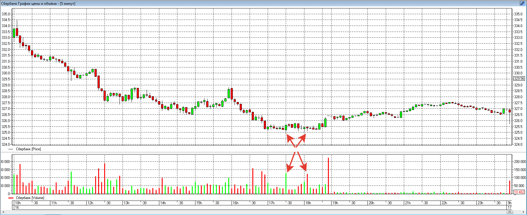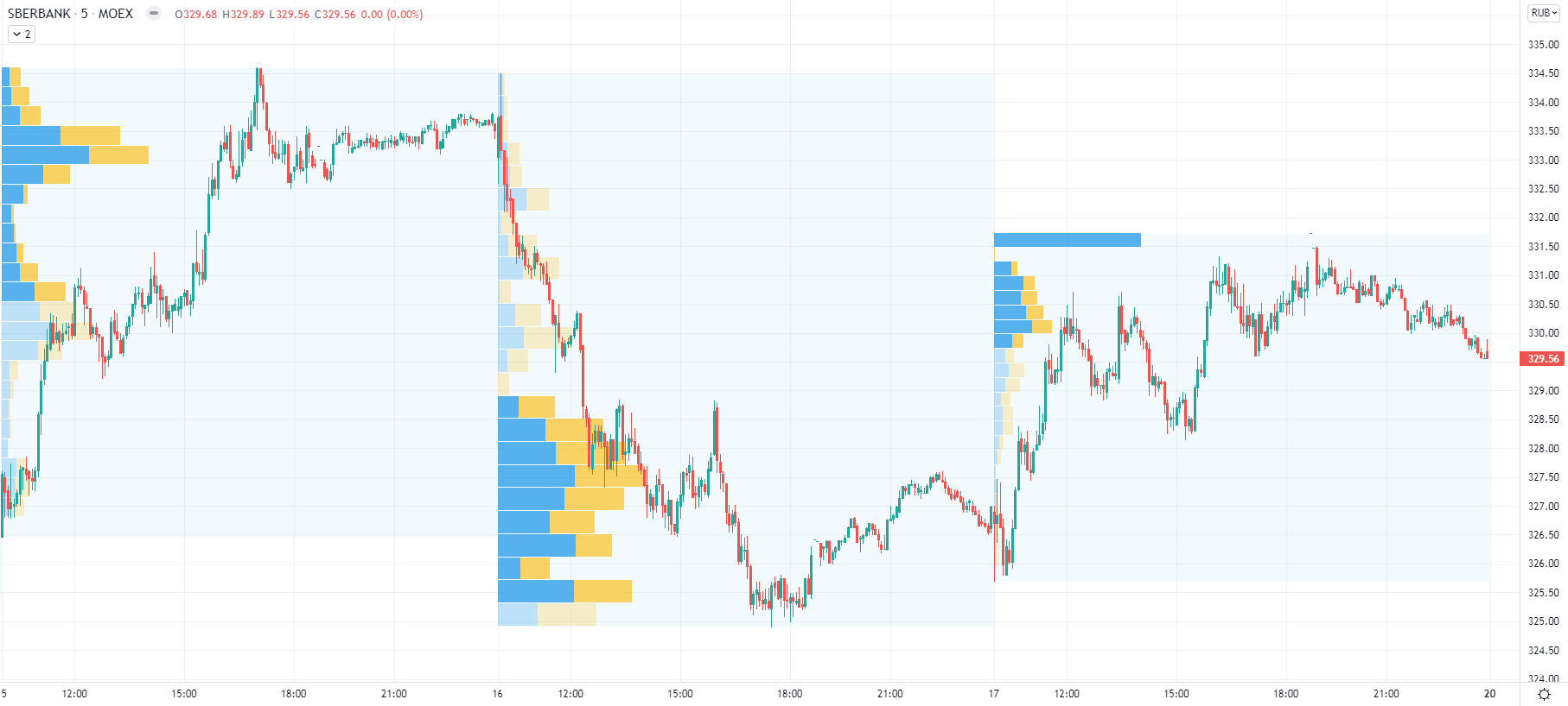 Посмотрите точно так же на 16 число, видно, что основные объемы сформированы как раз по самым минимумам. Объемы, которые сформированы в районе 327 — 328 рублей можно игнорировать, так как просто там инструмент долго пробыл, соответственно и контактов там прошло много. А вот нижний диапазон сильно выделяется.