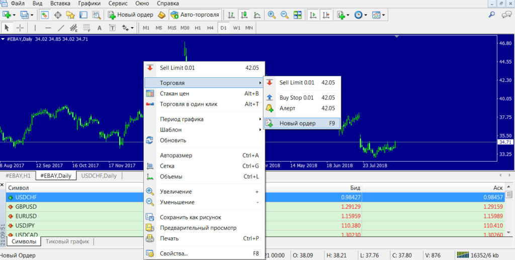 Для установки отложенного ордера в МТ4, щёлкните правой кнопкой мышки в окне графика того финансового инструмента позицию по которому планируете открывать. В появившемся меню перейдите по пунктам «Торговля» — «Новый ордер».