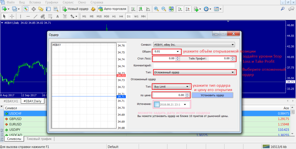 Мы выставляем отложенную заявку по следующему алгоритму: настраиваем цену сделки. Так как цена продажи выше, чем текущая цена, то опираясь на это, выставляем тип ордера – Sell limit. Как итог, у нас есть сделка, которая расположена на заданном нами уровне цены, и наш ордер активируется в случае, если наш прогноз насчет того, что пойдет ценовой откат, оправдается.При этом, нам не придется высиживать часами за торговым терминалом, ожидая точку входа в сделку.