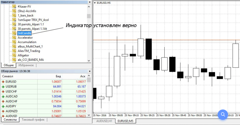 Устанавливается данный индикатор обычным способом. При этом трейдеру не понадобиться применять какие-либо дополнительные библиотеки либо скрипты. Если правильно установить его в соответствующую папку, он отобразится в “Навигаторе” МТ4. Появиться его название 3rd Candle.