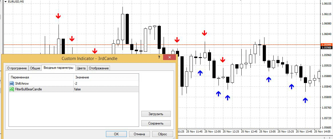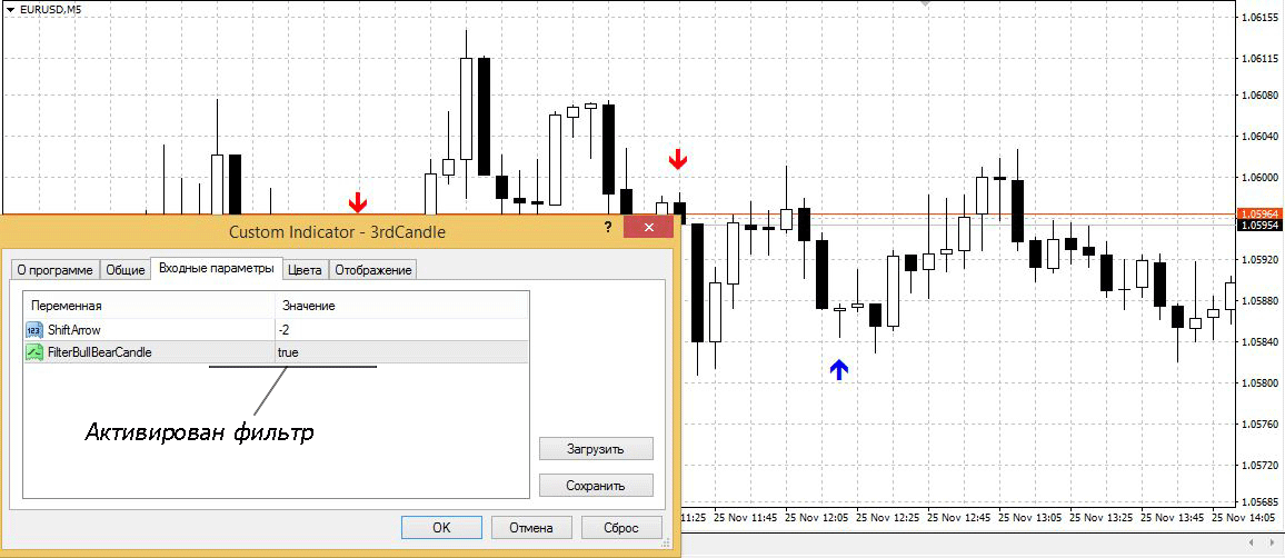 Стратегии “3 свечи” на Форекс в рамках одноименного индикатора Форекс имеет всего две настройки параметров: сдвиг “-2” (можно задавать смещение стрелки индикатора), а также фильтр по цвету свечи.