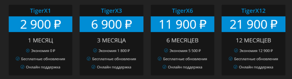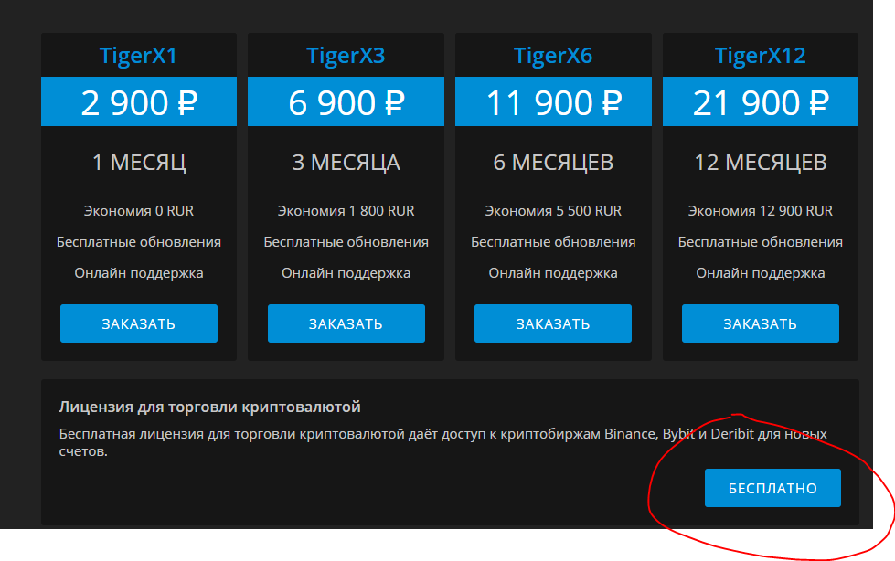 TigerTrade — Бесплатный торговый терминал для торговли криптовалютами от Российских разработчиков. Платная версия сохраняется для фондового рынка. Софт имеет бесплатную 2-ух недельную версию, после чего будет предложено приобрести тариф. Оплата производится в формате подписки. Стартовая цена за 1 месяц доступа начинается от 2900 рублей.