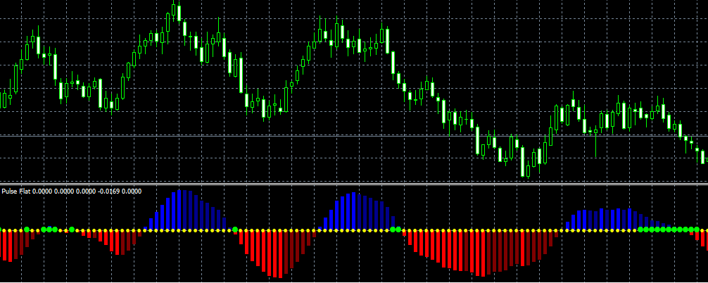 Рulsе Flаt рисуется в виде гистограммы, основанием которой служат зелёная или жёлтая линии. Жёлтая указывает на вхождение рынка в медвежий или бычий тренд. Зеленая свидетельствует о боковом движении цены.