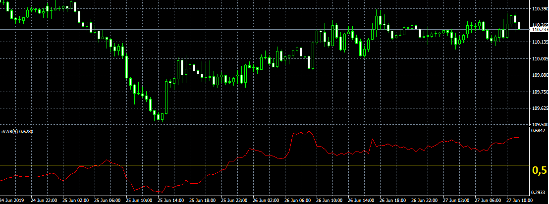 Третий индикатор – iVАR. Очень простой и понятный помощник. Представляет собой кривую линию, движущуюся выше или ниже уровня 0,5. О флэте сигнализирует нахождение кривой значительно выше линии, ушёл ниже – значит, движение цены изменяется на трендовое.