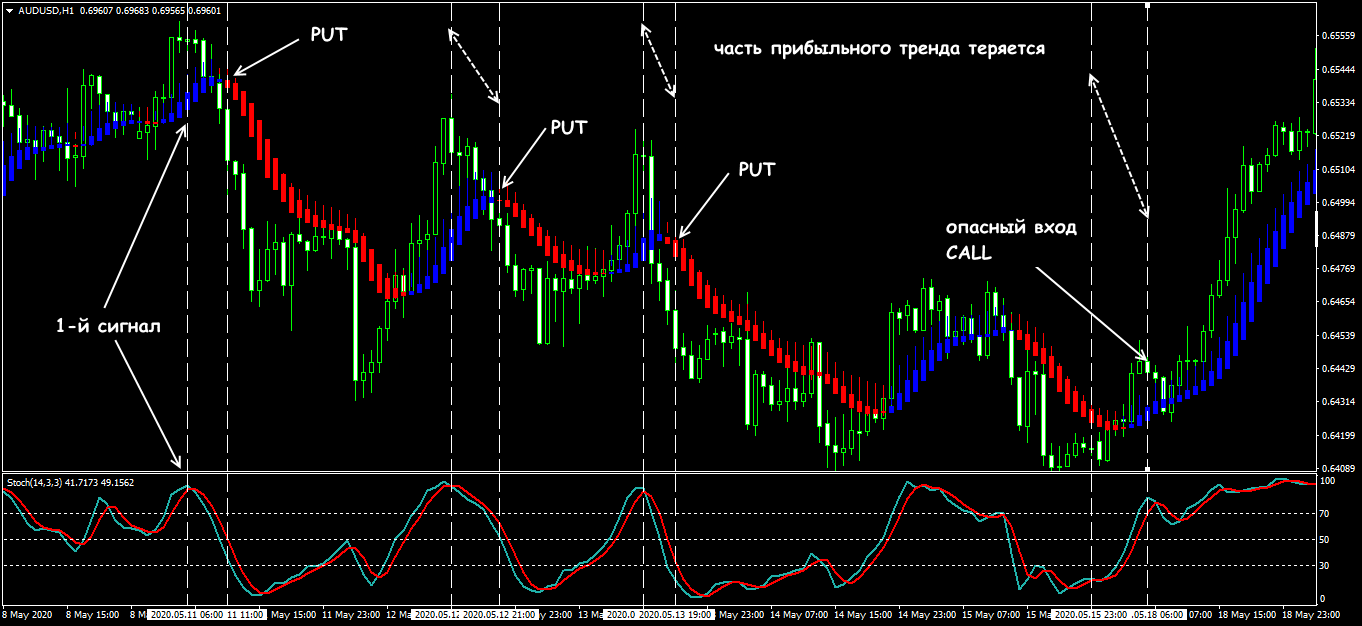 Проанализировав схему сочетания сигналов, опытный специалист быстро установит то направление, в котором необходимо приобретать контракт. Так, например, на приведенном ниже примере четко видно, что тренд не будет завершен в ближайшее время и у трейдера еще есть время на раздумья:
