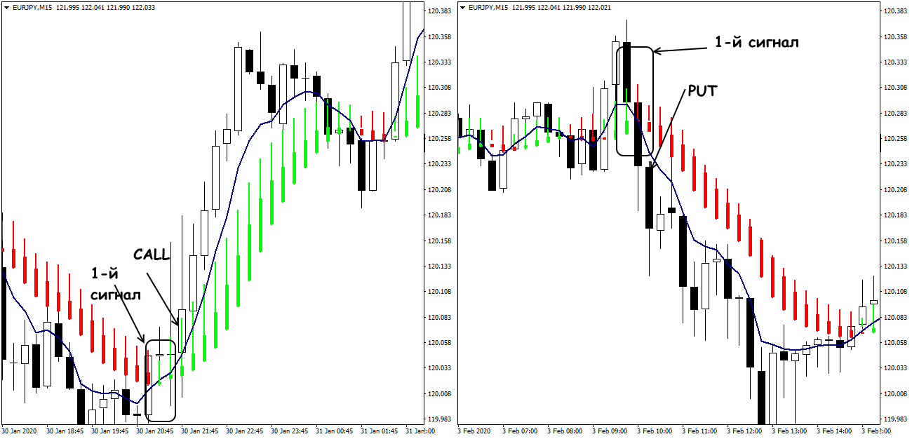 Приобретение контракта, суть которого является повышение цены, происходит в том случае, если возникает один из заранее предопределенных признаков. Однако для получения максимально корректного сигнала, необходимо использовать не один, а два графических окна.