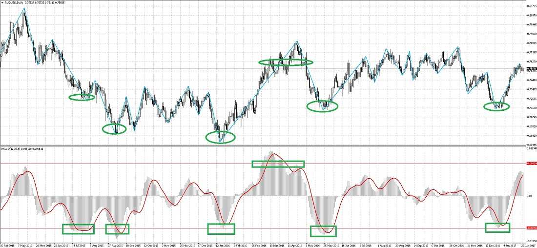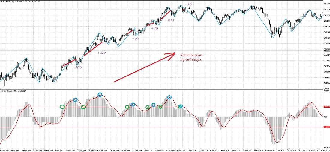 Поэтому следующий тип сигнала от этого индикатора – появление максимумов и минимумов, которые используются так же, как и в случае с другими осцилляторами. Единственный момент – у MACD нет определенных заранее уровней перекупленности и перепроданности. Анализ производится на глаз. На картинке выше я визуально определил уровень 0,0085 и нанес его на график. Как видно, пересечение уровня перекупленности/перепроданности в обратную сторону часто служит разворотной точкой для цены, ну или как минимум началом коррекции. Не всегда это работает с большой точностью, как, например, при работе с верхним уровнем на картинке, но, тем не менее, данный сигнал гораздо более надежен, чем у многих других осцилляторов. А в сочетании с уровнями точность или при работе по тренду точность увеличивается многократно.