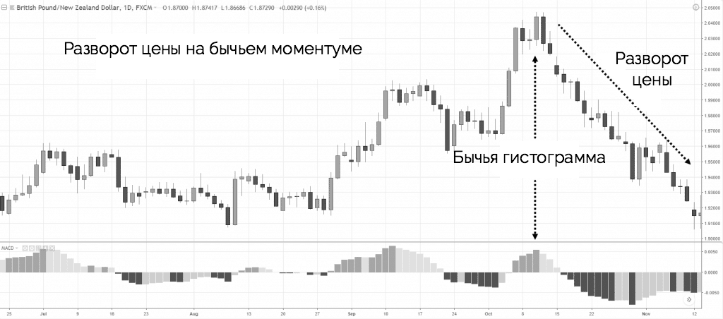 Аналогичная ситуация с нисходящей тенденцией. При возникновении и продолжении медвежьего тренда гистограмма и сигнальная линия направлены вниз и между ними также образуется много места. Это указывает на сильный нисходящий импульс. Пробитие выше линий скользящих средних будет означать окончание нисходящего тренда.