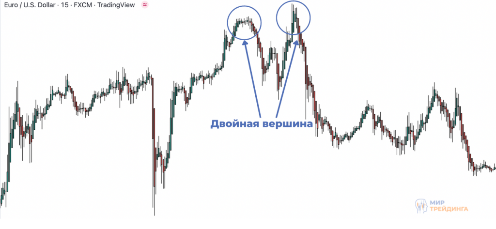 На графиках Heiken Ashi, как и на японских свечах, есть возможность найти определенные фигуры технического анализа. Точно также Хейкен Аши прекрасно отображает паттерн “двойная вершина”. Это разворотный паттерн двумя выразительными пиками. Они должны обновить локальный максимум и быть расположены примерно на одном уровне. Дополнительным подтверждением двойной вершины будут свечи “доджи”, которые расположены на самих вершинах.