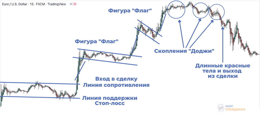 Вы также можете наблюдать фигуру “флаг”. Это паттерн продолжения тренда. Флаг появляется, когда после сильного восходящего или нисходящего тренда цена приостанавливается. Она начинает двигаться в пределах узкого коридора между двумя линиями, формирующими прямоугольник. И после консолидации, цена пробивает флаг и продолжает двигаться с новой силой по первоначальному тренду.