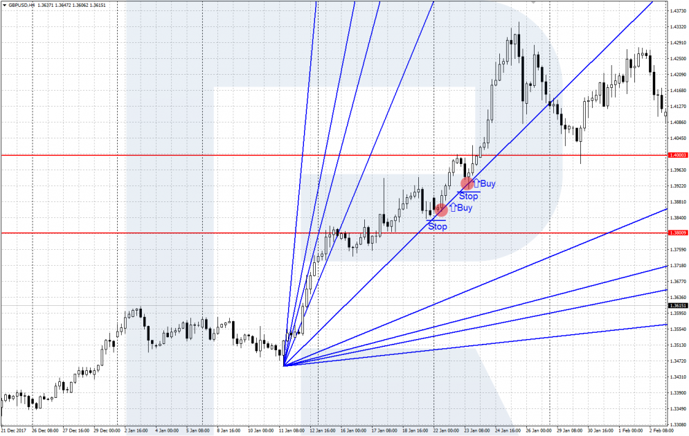 Если цена в ходе восходящей тенденции опускается к линии 1:1 и формирует на ней локальный минимум, после чего разворачивается вверх, можно открывать позицию на покупку. Стоп ставится за сформированный локальный минимум, Профит можно закрывать при достижении ценой линии 2:1. Для нисходящего тренда все аналогично в противоположном направлении – открывается позиция на продажу.