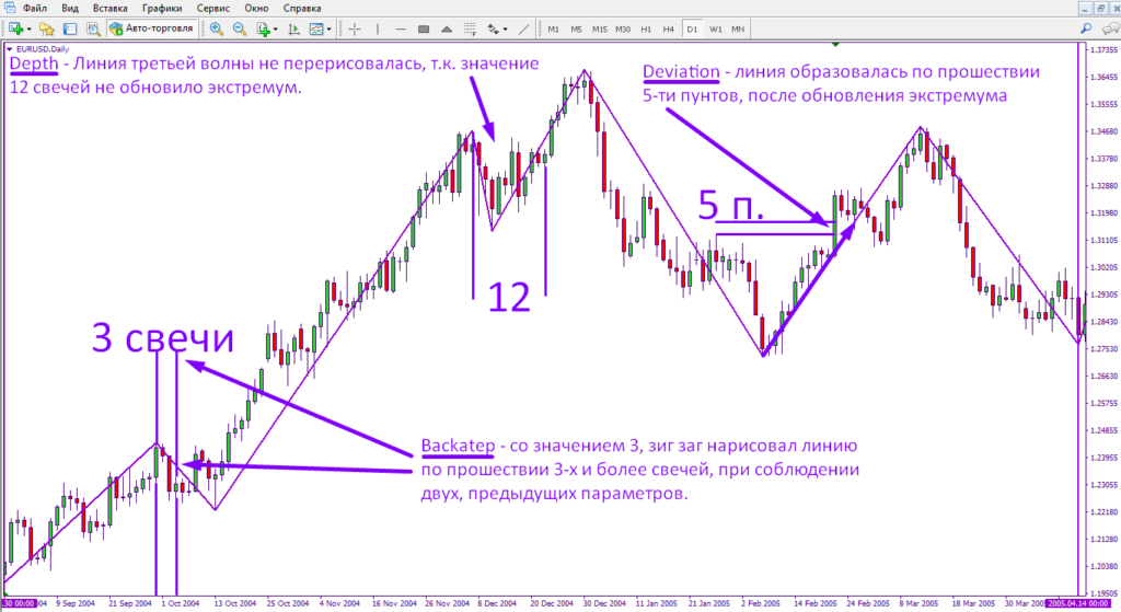 Depth – Глубина. Параметр, определяющий минимальное количество свечей при построении экстремумов. При установке меньшего значения, индикатор становится более чувствительным. Теперь простыми словами; предположим мы этот параметр изменили на значение 4. Тогда зиг заг будет рисовать все возможные коррекции, или линии в общем, но не допуская минимального значения 4-х свечей. То есть, если коррекция составляет 3 и меньше свечей, то зигзаг не будет рисовать следующую линию. А если свечи образовали коррекцию 4-х и более баров, то индикатор нарисует стержень, но при условии, что четвёртая свеча будет являться экстремумом, а не просто откатом. Стоит уточнить, что экстремум считается не от противоположного экстремума, а именно относительно 4-х свечей.