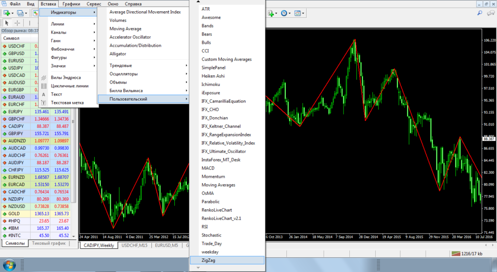 В торговом терминале МТ4, индикатор Зигзаг находится в пункте меню «Вставка» — «Индикаторы» — «Пользовательский».