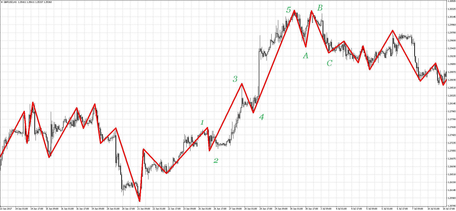 На данном скриншоте, с дневным тайм фреймом, актива EUR/USD, запечатлена ситуация просто идеально отражающая теорию волновой структуры. Здесь мы можем наблюдать 8 основных волн, каждая из которых прономерована цифрами соответствующего цвета. Волны, отмеченные зелёным цветом, являются восходящими по отношению к основному, более глобальному тренду. А волны, отмеченные красными числами, являются коррекциями этого же основного тренда.