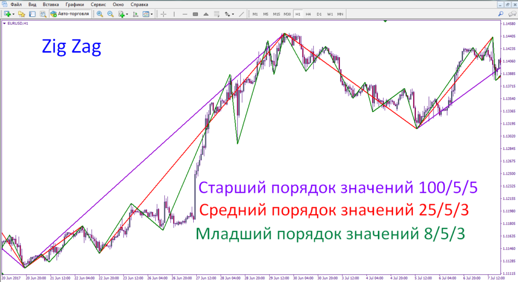 Например, на рис. 12 в переменной GrossPeriod сначала задан ТФ H1 (60 минут), затем ТФ H4 (240 минут), а затем ТФ D1 (1440 минут). Таким образом первые значения в параметрах Depth, Deviation и Backstep будут соответствовать ТФ H1, вторые – H4, третьи – D1. В результате на графике будут отображаться три ЗигЗага (причем на любом ТФ), соответствующие указанным таймфреймам (рис. 13). Переменная MaxBar задает длину временного интервала, на котором будет производиться расчет на каждом ТФ.