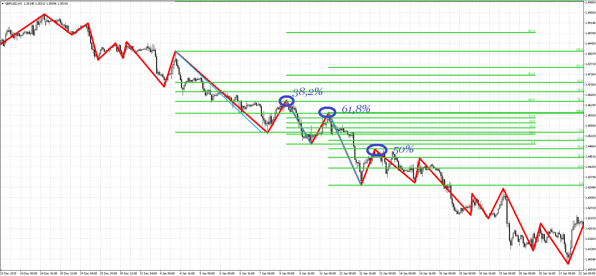 На графике отчетливо видно, что при натяжении уровней Фибоначчи ZigZag наглядно показывает отбитие от важных ценовых уровней: