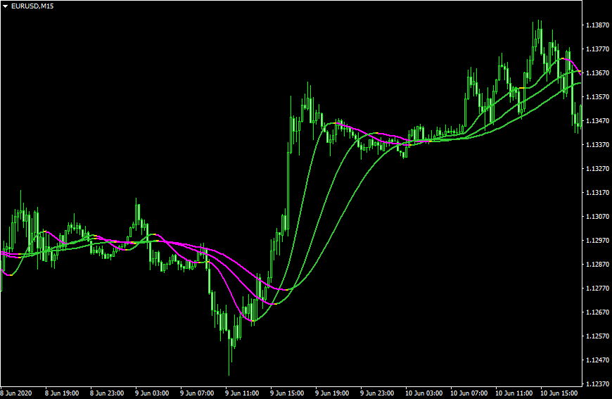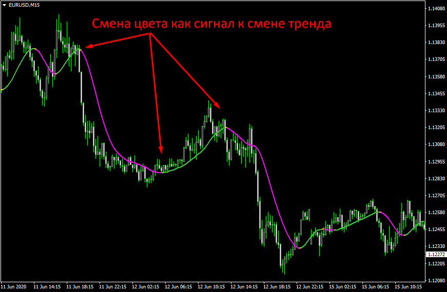 Данный трендовый индикатор вполне можно назвать полноценной торговой системой, так как он подаёт сигналы для входа и не перерисовывается. Всё довольно просто – при смене цвета скользящей средней выступающей в роли сигнализатора входим на продажу или покупку в зависимости от цвета.