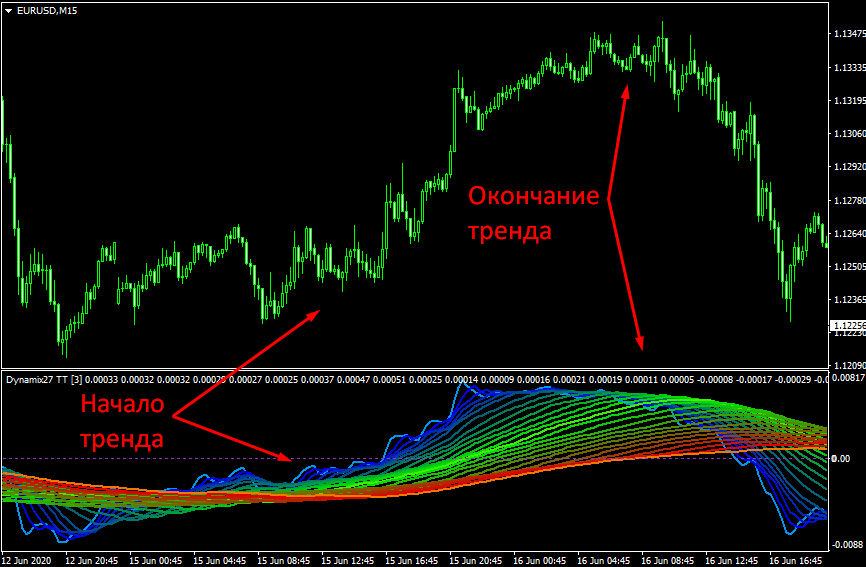 Также имеет значение положение этой радуги относительно фиолетовой пунктирной линии – нулевого значения. Если весь веер линий пересекает его снизу вверх или сверху вниз – значит появился новый тренд либо идёт коррекция на старших тайм-фреймах. В этот момент можно оценивать ситуацию по дневному или недельному графику. Не самые популярные периоды у трейдеров, но они в данном случае используются просто для оценки ситуации.