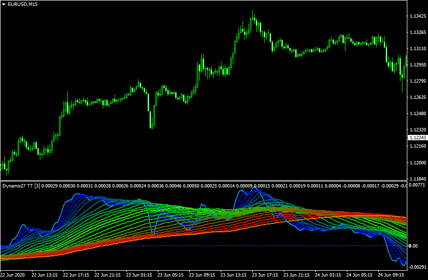 Ещё один представитель трендовых индикаторов, построенный на скользящих средних. Внешний вид в некоторой степени может напоминать осциллятор, при этом есть некоторые схожести и в методах вычисления. Сам он состоит из почти трёх десятков скользящих средних, нормализованных по нулёвому значению. Каждая из них сопоставляется со значением определённого количества свечей назад (кратно десяти), и результат выводится относительно нулевой отметки.