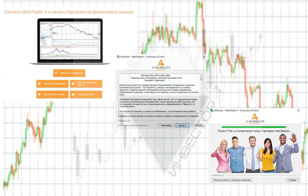 AMarkets – лучший брокера, у которого реально торговать CFD. Для начала торговли, нужно пройти не сложную регистрацию. Торговля в AMarkets, происходит через терминал MetaTrader. Подробная инструкция по установке, на этой картинке. Шаг за шагом и по порядку.
