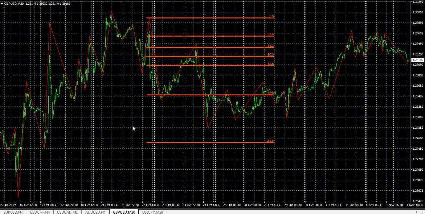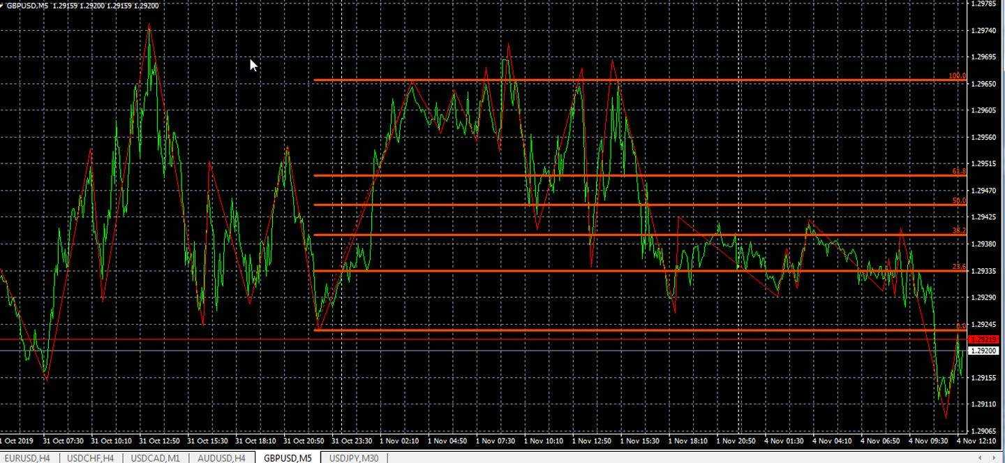 Пример, когда не работает индикатор «фибо-линии» — цена в/п GBP/USD на ТФ М5 отскочила от уровня 100 и ушла за пределы 0,0.