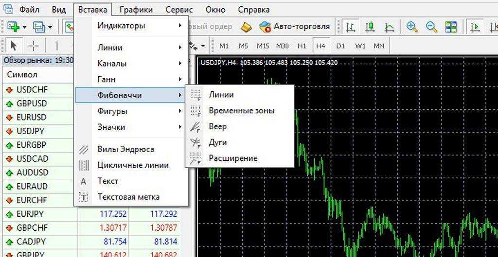 Чтобы воспользоваться инструментом, достаточно кликнуть в верхней строке меню терминала окно «рисование линий Фибоначчи» либо открыть вкладку «вставка» и перейти на «Фибоначчи» — «линии».