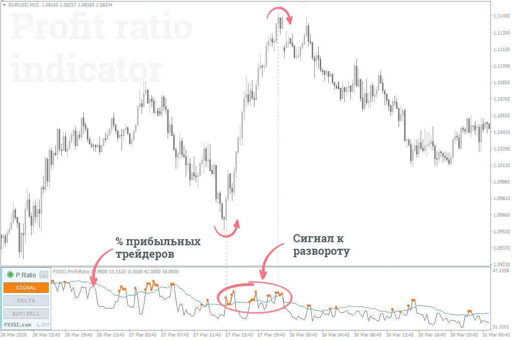 Обращайте внимание на: резкие всплески (увеличение) прибыльных трейдеров. В случае подобного явления серая линия индикатора будет подкрашена оранжевым цветом, что является сигналом о возможном развороте цены