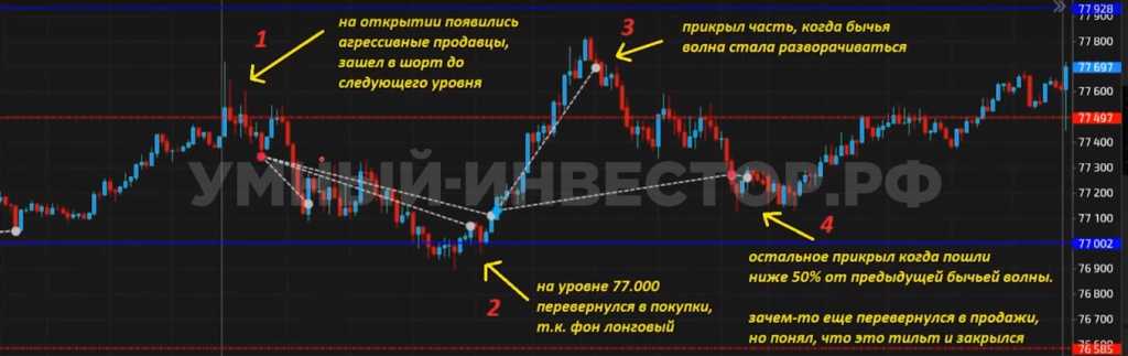 Теперь посмотрим на сделку моего ученика, с визуальным примером ниже. Вообще, торговля против тренда (именно локального), неплохо меня кормит. Кормит моих учеников, и будет кормить вас, если вы будете меня слушать! Посмотрите, на открытии рынка появились агрессивные продавцы, где мой адепт продал, ориентируясь от локального уровня 77 500, до следующего уровня.