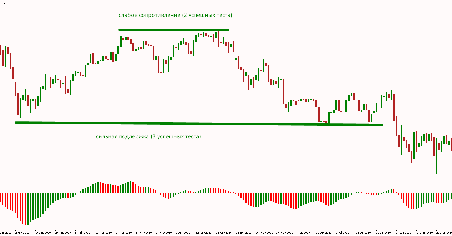 Очевидно, что чем чаще тестировалась линия, тем больше ее сила. Определяются такие уровни визуально – обычно на старших таймфреймах от H1 до W1. Вот как они выглядят на дневном графике.