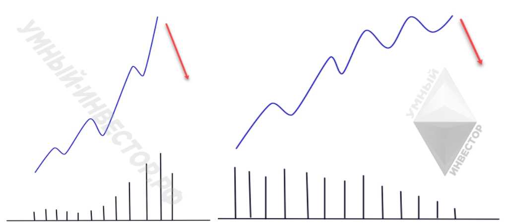 В другом варианте смены направления движения напротив, вместо кульминационного ускорения, цена затухает медленно. Примечательно, что в таком случае с каждой новой волной локального интервала, угол наклона «атаки», будет постепенно меняться. То есть, становиться всё положе и положе. А гистограммные объёмы при этом наоборот, буду уменьшаться. Что в итоге с большой вероятностью, может привести к смене тренда.