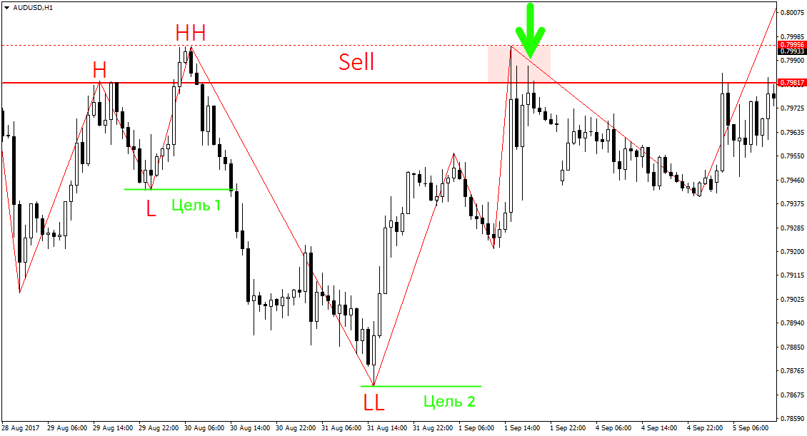 Точка входа может быть довольно таки далеко от образовавшегося сетапа. В данном случае, у нас был некий тренд вверх. Сперва отмечаем первый хай, затем лоу и более высокий максимум — HH. Затем, следуя подсказкам ЗигЗага, мы обнаруживаем более низкий минимум LL, расположился который довольно таки далековато. Точка входа на продажу будет располагаться на уровне H.