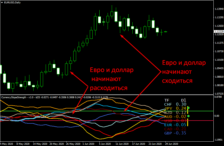 Сигналами принято считать пересечения линий, но только тогда, когда это происходит не так далеко от среднего значения. При хорошем раскладе можно поймать большие движения, когда одна валюта начинает расти по отношении ко всем остальным, а другая, наоборот, начинает падать ко всем. В этом случае получаем максимальное расхождение спроса и предложения, что на индикаторе тренда CP отражается в виде расхождения линий этих валют. Также после этого обычно следует и мощная коррекция, что тоже позволяет зарабатывать.