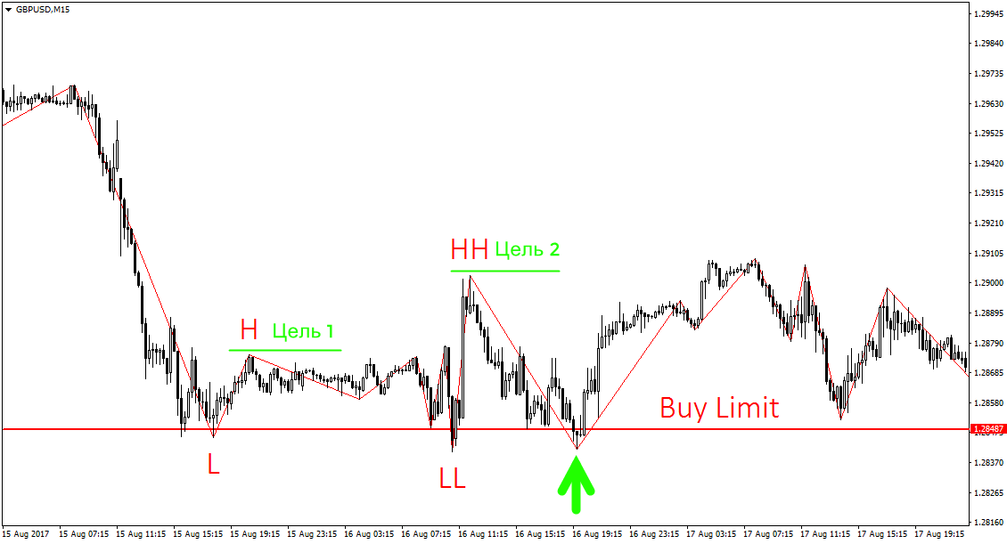 Когда же появился более высокий максимум — HH, то есть, нарушилась структура нисходящего тренда, мы начинаем искать покупки. В данном случае, нам необходим откат к точке L. После формирования точки HH выставляем Buy Limit на уровне L и ждем. В данном случае, цена до нашего ордера не дошла и ушла вверх.