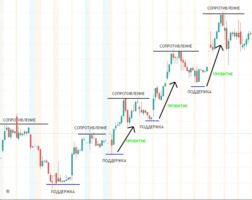 Анализ поддержек и сопротивлений позволяет подтвердить преобладающую рыночную тенденцию. В случае восходящего тренда очень часто после пробития сопротивления оно становится поддержкой. В такой ситуации ретест пробитого сопротивления является хорошим местом для так называемого «второго входа». Поскольку в восходящем тренде доминирует спрос, каждая коррекция рассматривается «поздними наблюдателями» как хорошая возможность для занятия длинных позиций. Чем больше ожидание, тем короче и мельче коррекция. Это называется «покупать падения».