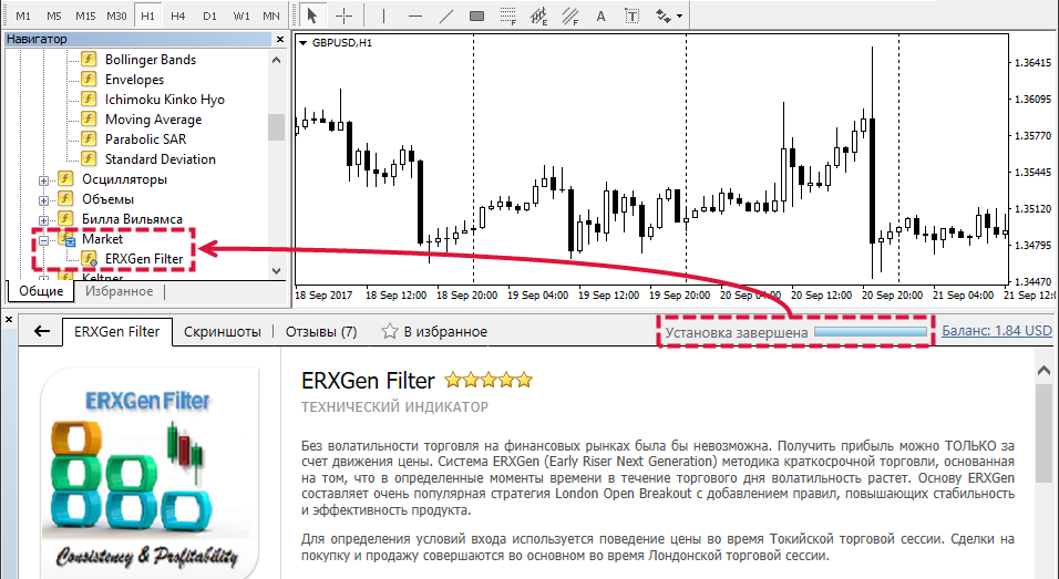 Для запуска индикатора просто перетащите “ERXGen Filter” из окна навигатора на график инструмента.