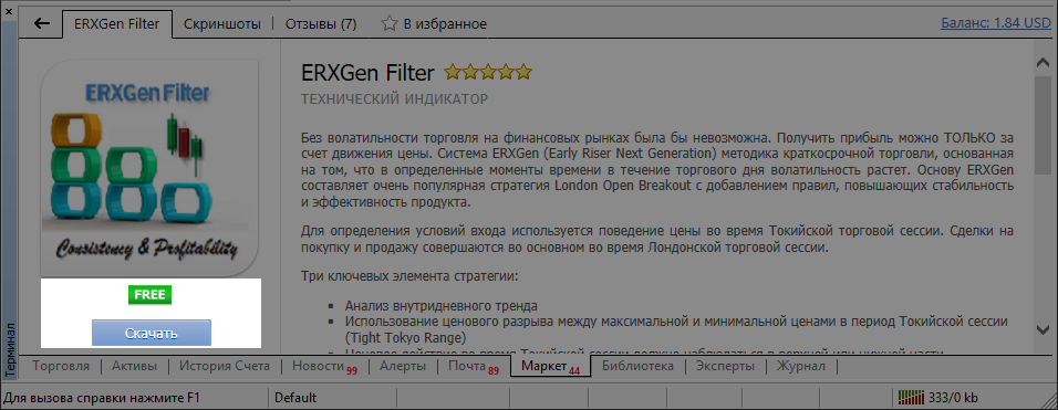 На странице продукта нажимаем “Скачать” — начнется загрузка индикатора в терминал.