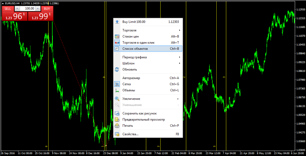 Чтобы отредактировать остальные свойства индикатора, необходимо вызвать меню его настроек. Для этого кликните правой кнопкой по произвольной точке окна ценового графика и в выпавшем меню выберите пункт «Список объектов».