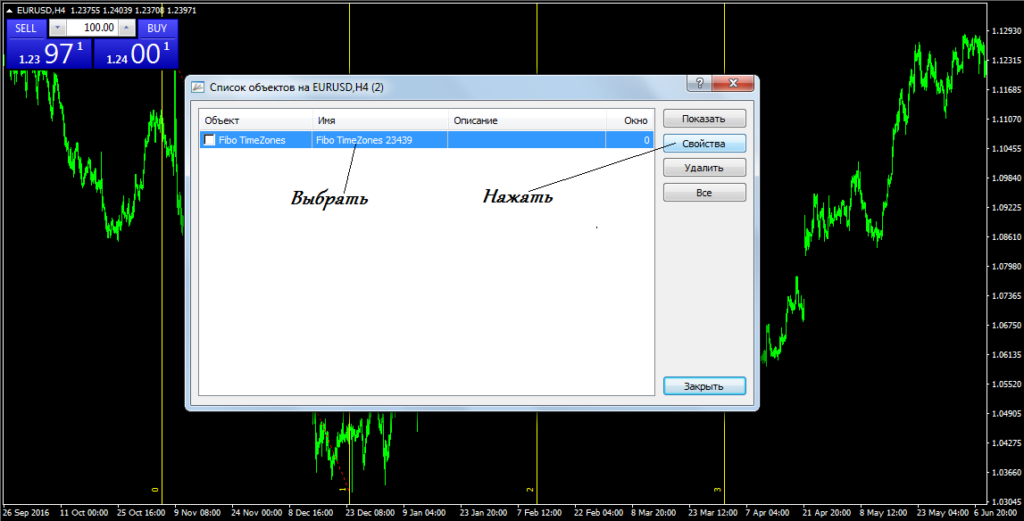 В появившемся окне выделите строку Fibo Time Zones и нажмите «Свойства».
