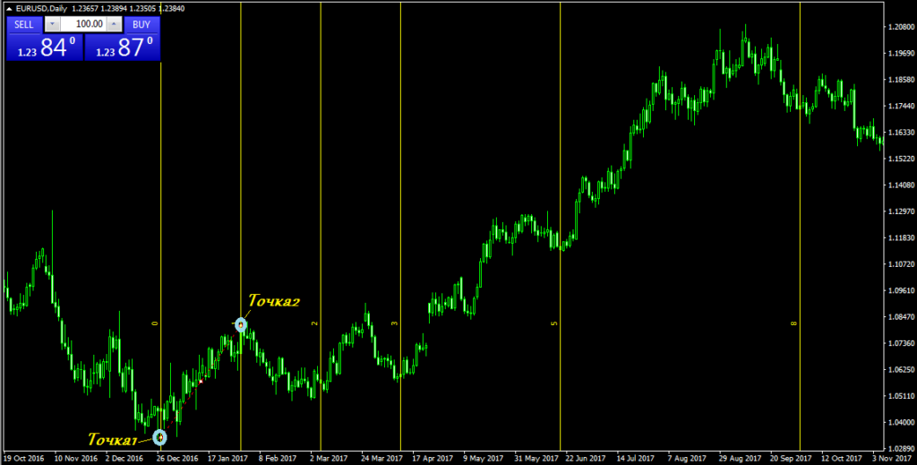 Для отображения временных зон Фибоначчи на графике, необходимо проставить две точки. Эти точки ставят на важных ценовых экстремумах. Получается, что первые две линии временных зон как раз проходят через эти два экстремума, и предполагается, что остальные линии, также будут совпадать с очередными пиками и впадинами графика.