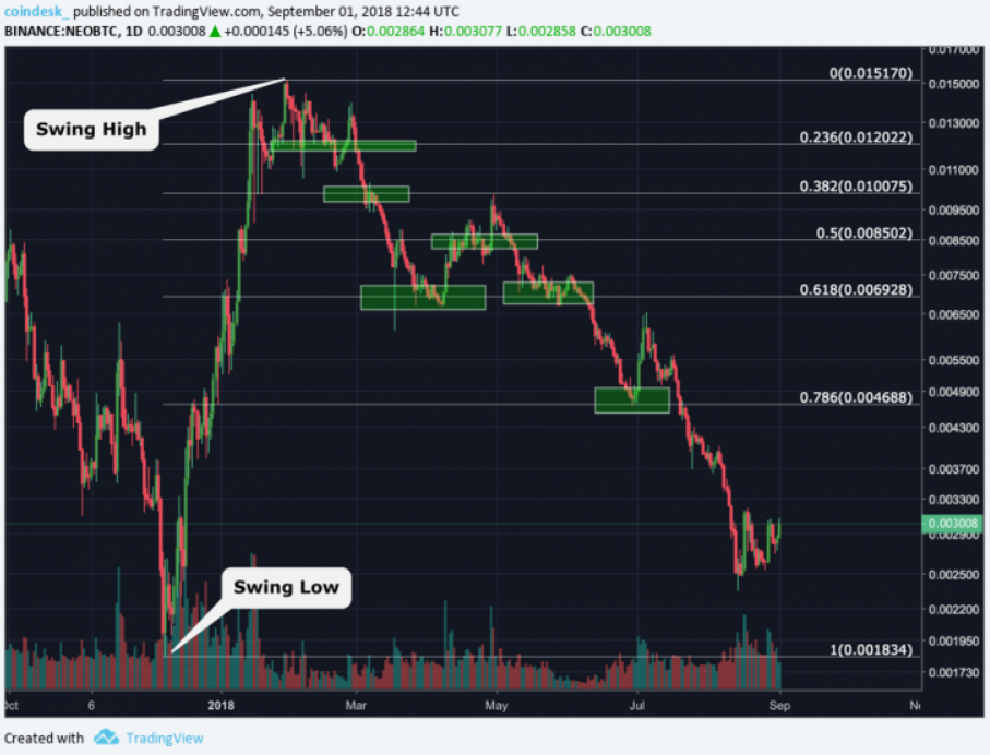 На приведенном выше графике минимум тренда NEO (NEO / BTC) 0,001834/BTC был соотнесен к максимуму тренда 0,015170/BTC при помощи инструмента «Уровни Фибоначчи».