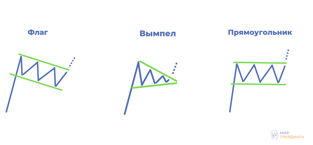Вторыми на очереди идут фигуры продолжения тенденции. Как правило, трейдеры отрабатывают их чаще других ввиду простоты и логичности.