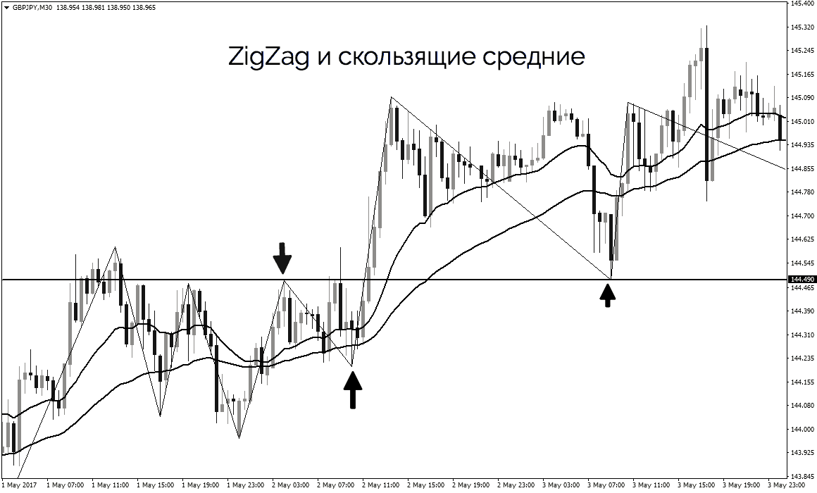 Следующий метод поможет фильтровать некоторый шум – добавить к Зигзагу скользящие средние. В паре инструменты точнее определят динамическую поддержку или сопротивление. Так более точно можно определить момент открытия сделки.