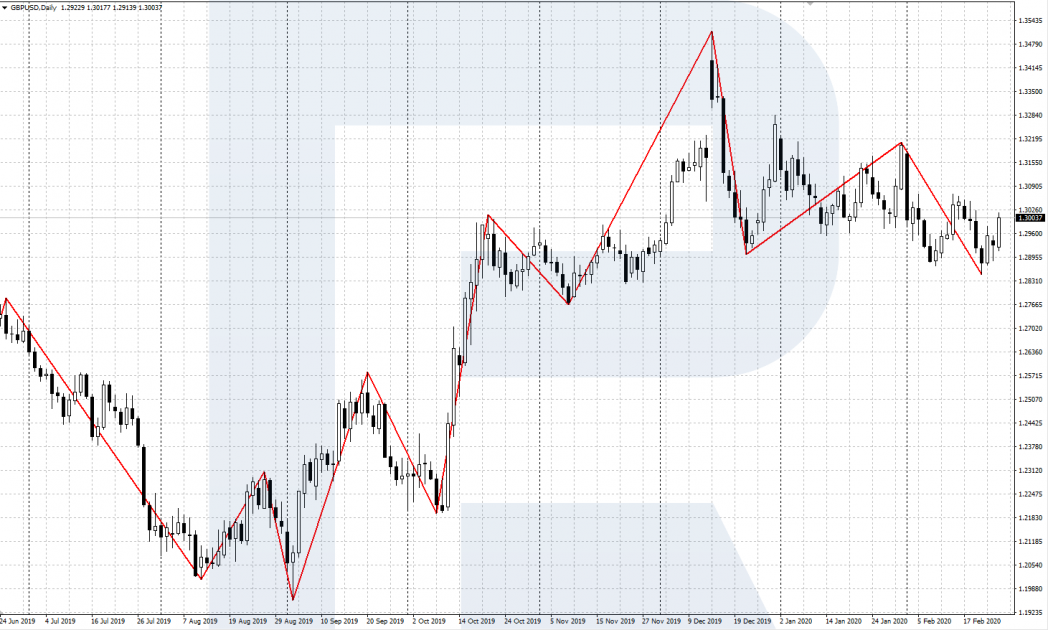 Согласно заданным настройкам ZigZag соединяет прямыми линиями сформированные на графике вершины и впадины. При этом нужно учитывать, что последняя линия индикатора находится еще в процессе отрисовки и может перерисовываться до тех пор, пока окончательно не сформируется последний максимум или минимум.