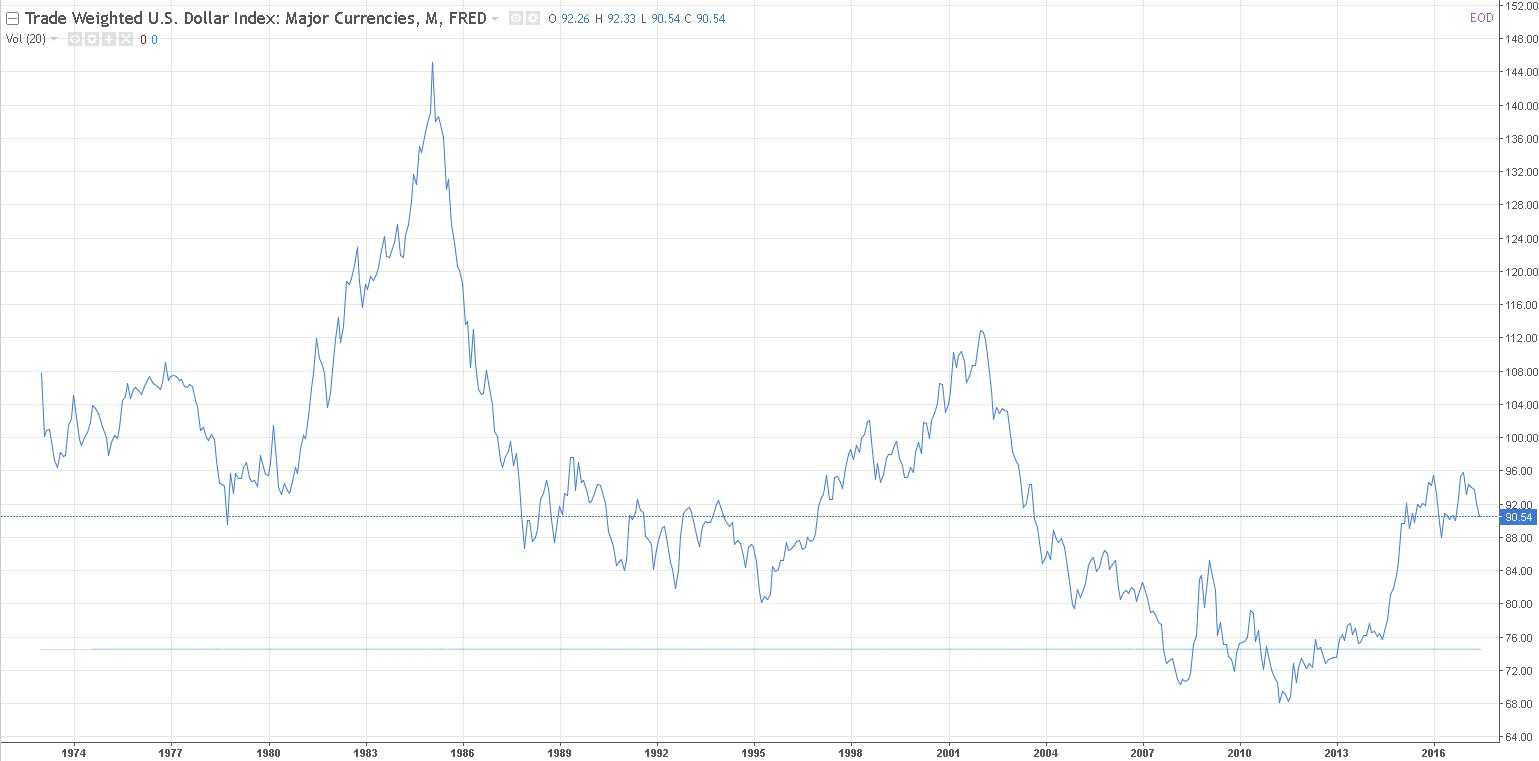 Его создали, чтобы более точно отображать стоимость доллара по отношению к другим национальным валютам, с учетом конкурентоспособности американских товаров и услуг. Относительная сила или слабость движения доллара США отображает огромные потоки денег. Рост индекса доллара США на 10% равносильно номинальному падению стоимости мирового богатства на более чем 1 трлн. долларов. Движение такого масштаба не происходит в вакууме, а относительная слабость индекса доллара отражает соответствующую слабость торгово-взвешенного индекса.